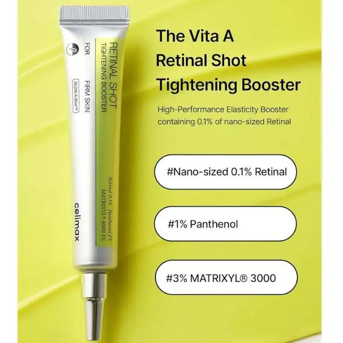 Celimax The Vita A Retinal Shot Tightening Booster একটি শক্তিশালী অ্যান্টি-এজিং ট্রিটমেন্ট যা ত্বকের দৃঢ়তা ও ফার্মনেস বাড়াতে কাজ করে। এতে থাকা রেটিনাল ও নিয়াসিনামাইড যৌথভাবে ত্বকের সেল রিনিউয়ালকে ত্বরান্বিত করে, ম্লান ও নিস্তেজ ত্বককে করে উজ্জ্বল ও টাইট। এর হাইড্রেটিং ফর্মুলা ত্বকে কোমলভাবে কাজ করে, কোন জ্বালা বা শুষ্কতা ছাড়াই দেয় পুনর্জীবিত ত্বকের অনুভূতি।